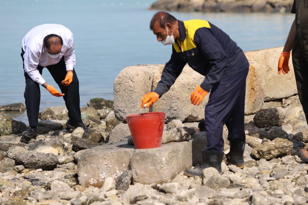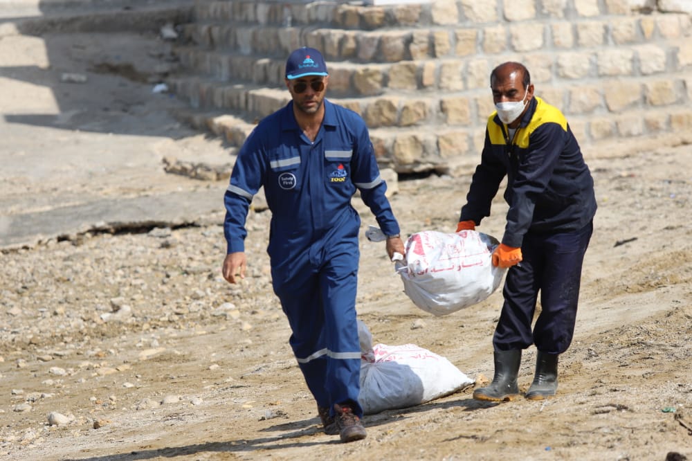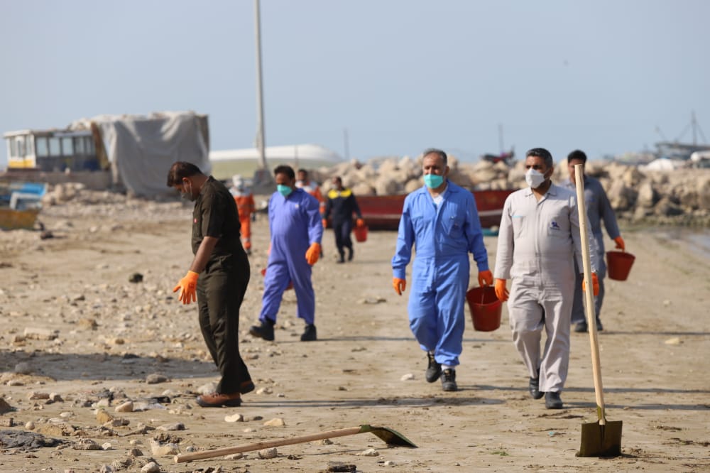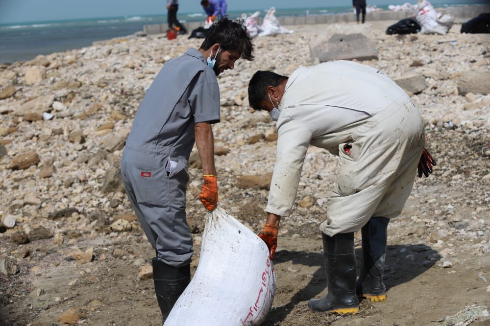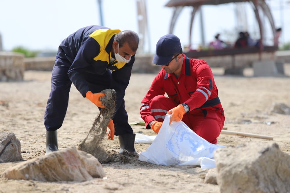 جمعآوری و پاکسازی آلودگی نفتی ساحل بوشهر توسط کارکنان شرکت نفت فلات قاره ایران